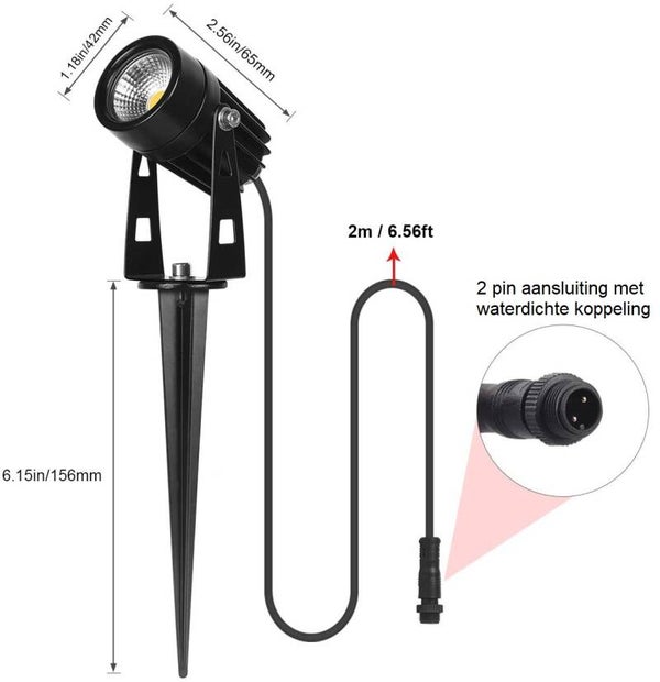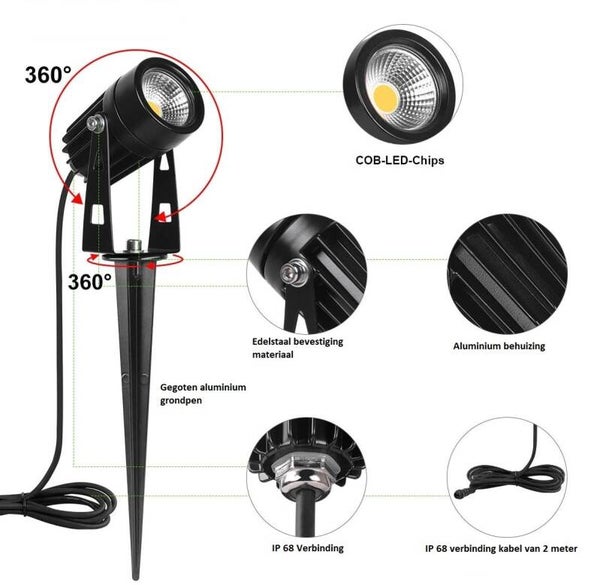 De tuinspot is gemaakt van gegoten aluminium en is duurzaam. Met geavanceerde COB LED lichtbron van 3W / 360LM per lamp, totaal 1080LM, super heldere en uniforme straal, groot bereik & stralingsgebied, kleur 3000K.
