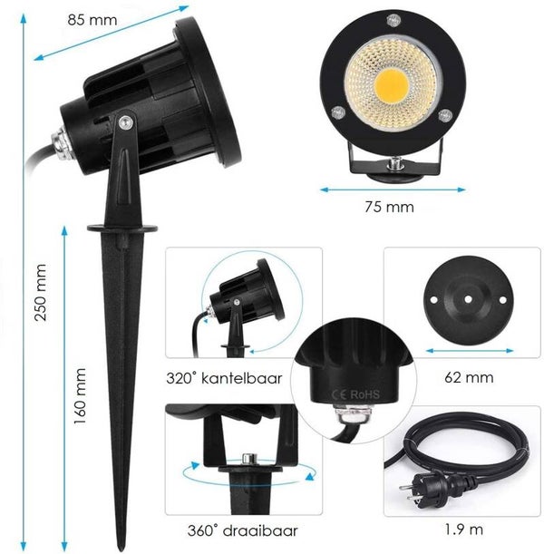 7W LED tuinspot 3000K en 800 lm. Superheldere en gelijkmatige straal, glazen lens met hoge doorlaatbaarheid, genoeg verlichting voor je tuin, terras oprit etc.